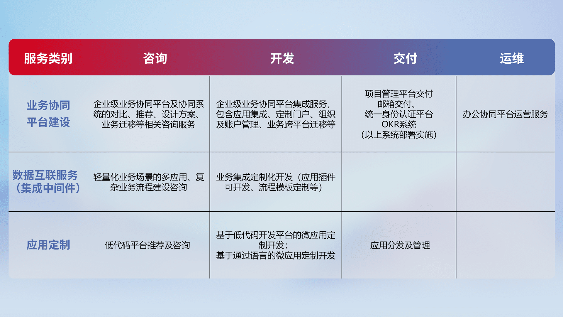 针对钉钉、、企微、、、、IDaas等平台级产品提供产品的规划、、方案、、、交付、、定制化开发等服务,,,实现如统一协同办公、、、智能客户服务、、混合会议管理、、智能数据查询、、、等业务场景,,,实现数字化转型。。