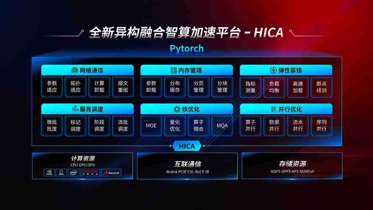 通过自研的服务层、、、、中间适配层、、以及调度编排算法,,,,采用数据并行、、、、模型并行等多种并行方式,,,把并行计算任务进行有效的分解,,使其分别由相应的软件栈和算力资源来承接。。。当GPU资源变化,,,HICA可以实时动态调度计算子任务并调整模型拓扑和架构,,,,以充分聚合各种算力资源。。